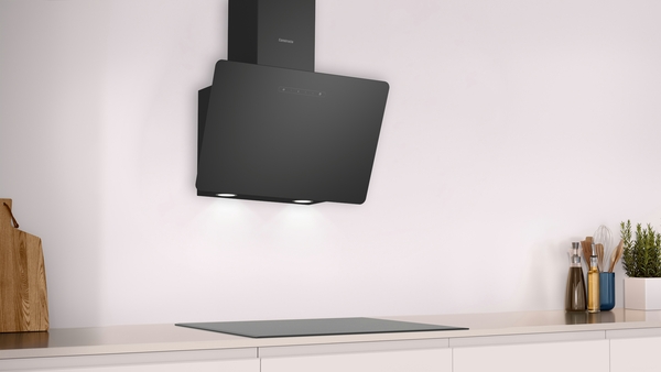- Schräg-Design: Modernes, schwarzes Glasdesign für hervorragende Kopffreiheit und Übersicht beim Kochen.