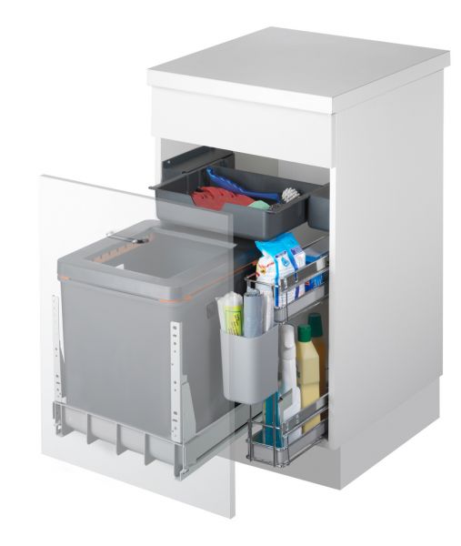 Mit Putzmittelauszug - Abfallvolumen: 35 Liter - Auszugsystem bis 100 kg belastbar - Behälter zur Rundbefüllung des 35-Liter-Abfallsacks - Optional zwei 17-Liter-Abfallsäcke - Putzmittelauszug links oder rechts - Drahtkorb aus rostfreiem Inox - Herausziehbare Abdeck-Schublade - Bei sperrigem Siphon - Schubladen-Rückwand verstellbar - Ideal für 50-cm-Korpus - Einzugsdämpfung als Standard - Montage: Schrankboden und Frontblende
