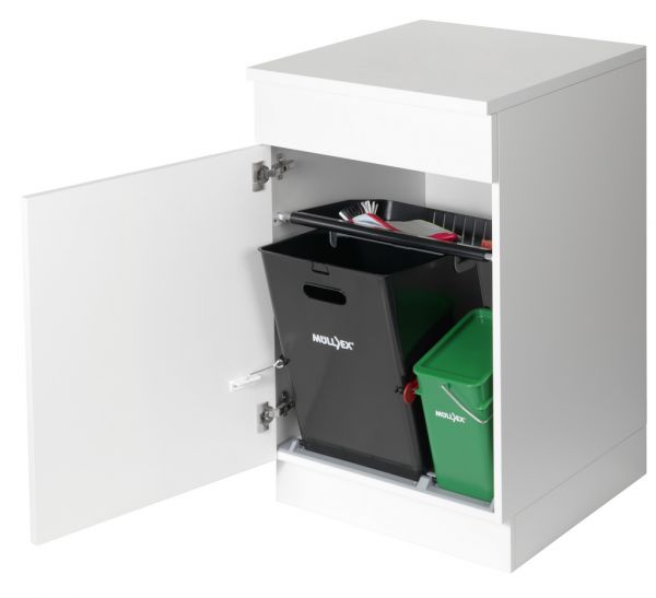 Für 550 - 600 mm Schrankbreite - Abfallvolumen: 40 (35+5) - Abfallbehälter 35- Liter für 17- und 35-Liter-Säcke - Komposteimer TERRA 5 mit Deckel und Tragbügel - Verschlussdeckel als Ablage für Putzutensilien und Sackrolle - Halterung mit Zughaken verhindert Belastung der Schaniere - Mitnehmer zur Verbindung der beiden Behälter - Montage: Schrankboden