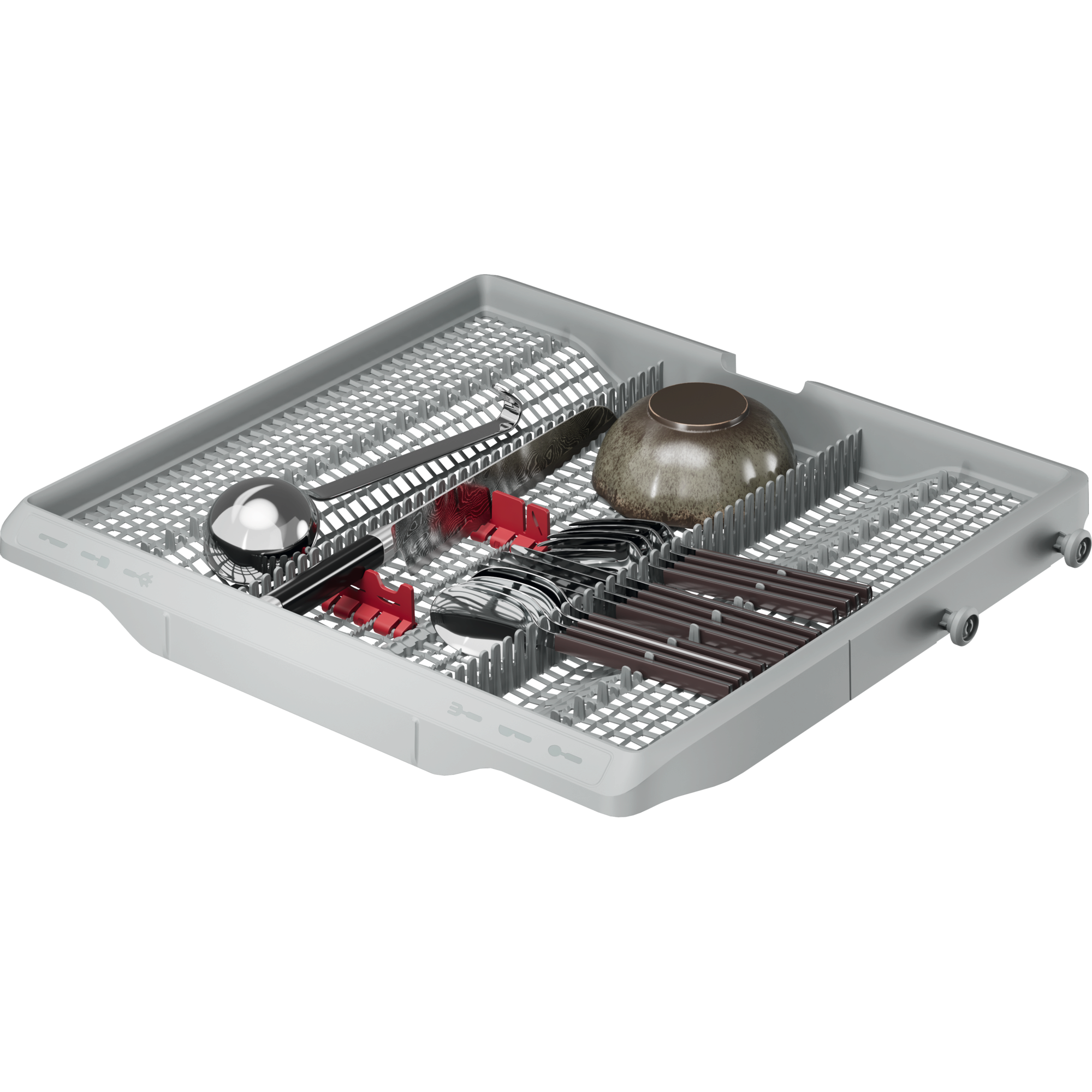 Die leichtläufigen EasyFlex Körbe haben rutschfeste SoftSpikes®, um Gläser und Empfindliches vor dem Zusammenstoßen zu schützen. Schaffe mehr Raum für großes oder ungewöhnlich geformtes Geschirr durch die klappbaren Zinken. Die Besteckschublade bietet Platz für Schneebesen und Suppenkellen.