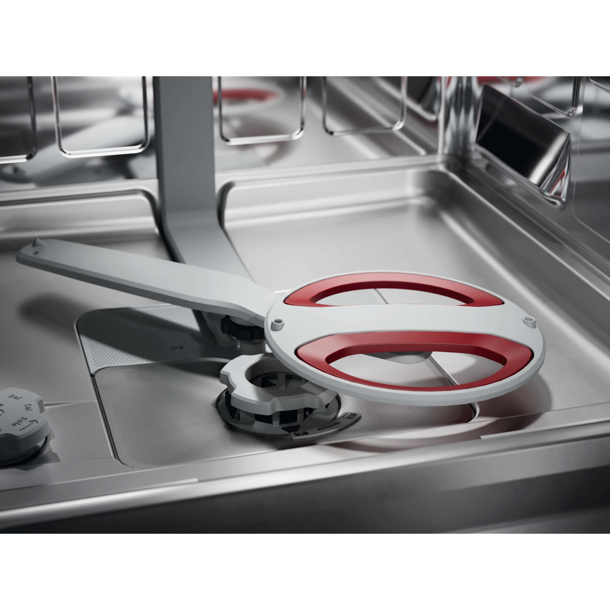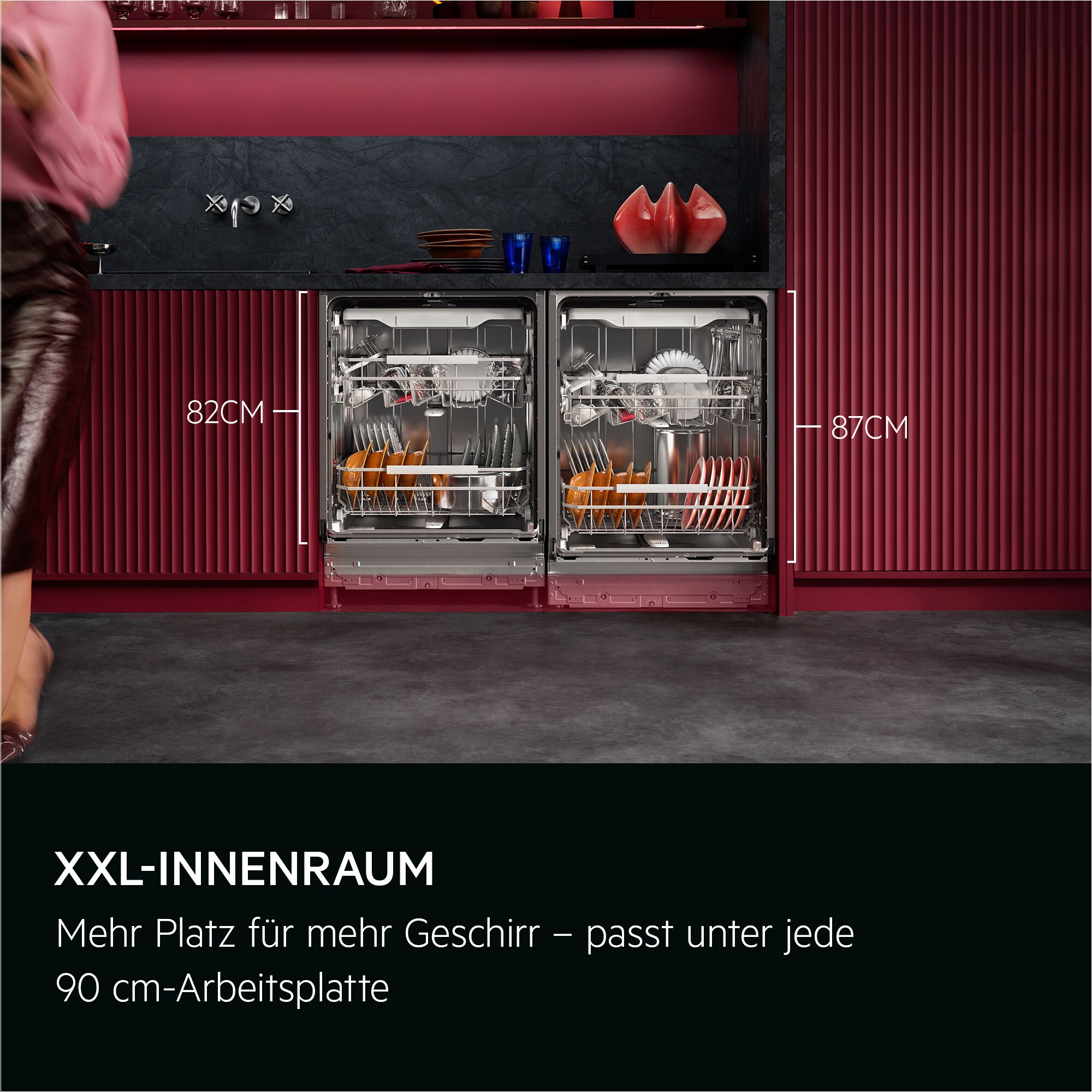 AEG Geschirrspüler der Serie 7000 XXL verfügen über 5 cm mehr Platz und passen unter eine 90 cm hohe Arbeitsplatte. Sie reinigen effektiv, dank des neuen hocheffizienten Wassersystems bei einem geringen Wasserverbrauch von nur 8.4 Litern.