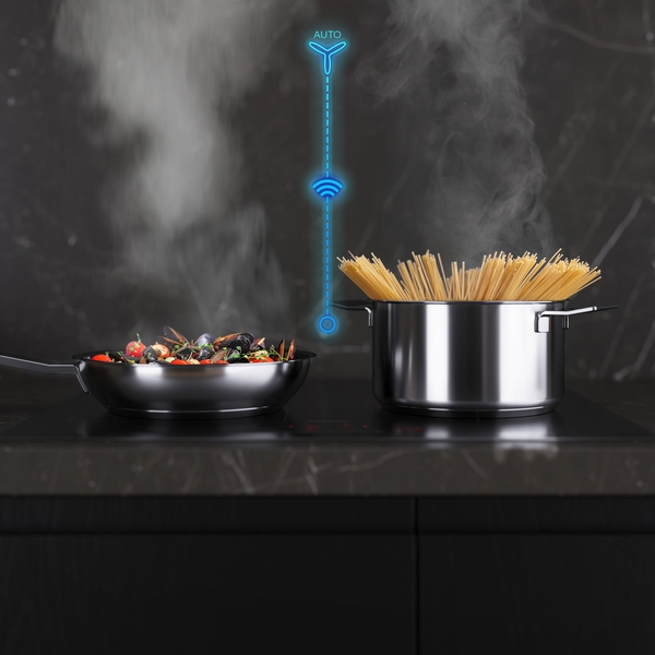 powerBoost-Funktion für alle Induktions-Kochzonen möglich: Mit 50 % mehr Leistung z. B. Wasser schneller zum Kochen bringen als auf höchster Leistungsstufe.