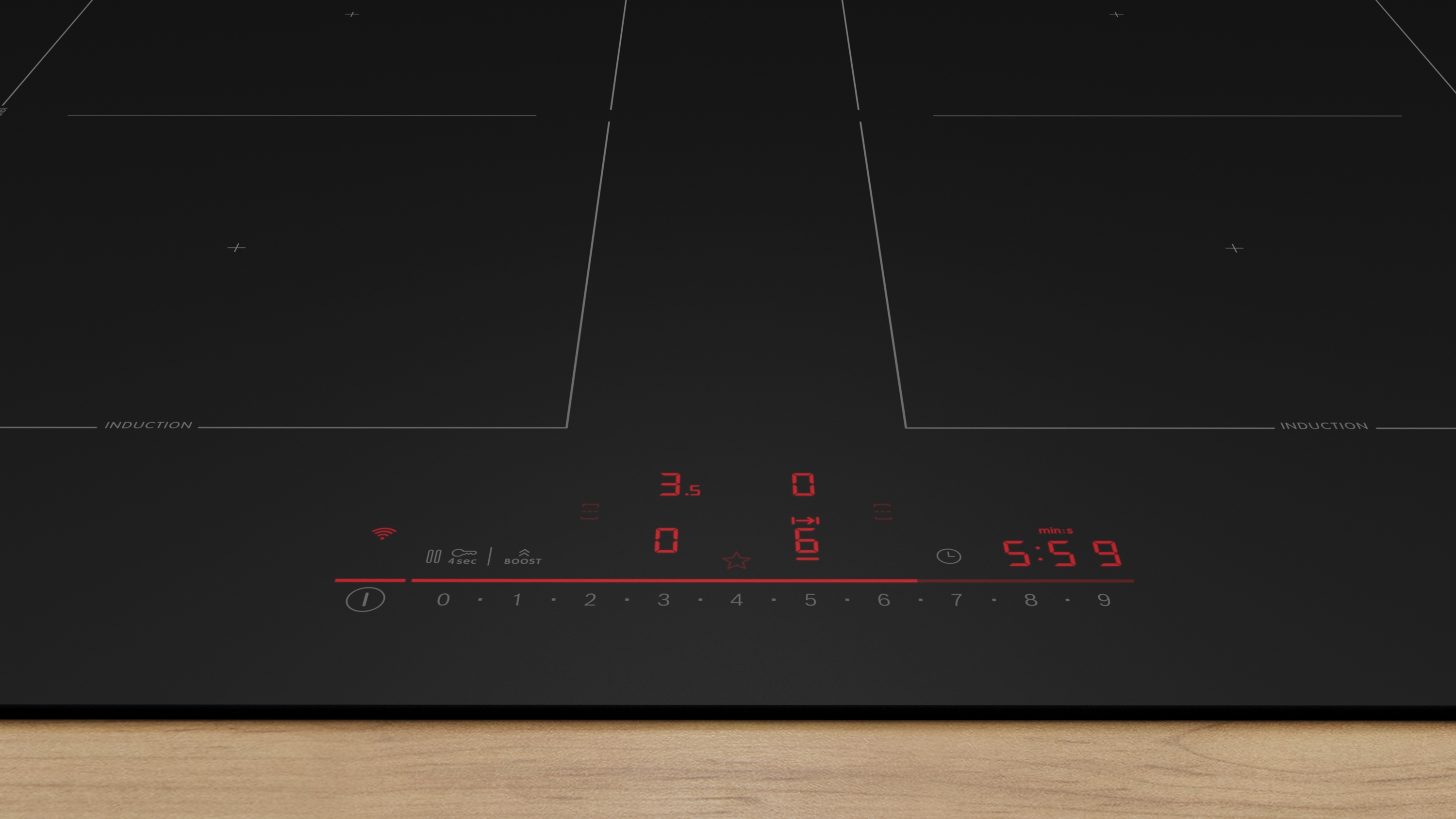 - Combi Zone: verbinde zwei Kochzonen, um besonders großes Kochgeschirr zu erhitzen.