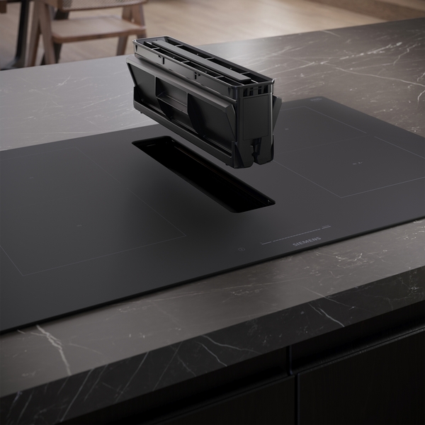 Induktionskochfeld mit vollintegriertem, leistungsstarkem Downdraft-Abzugsmodul.