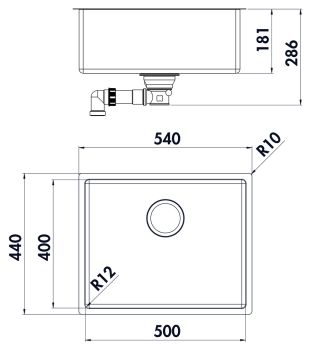 Einzelbecken. 3½" Ab- und Überlaufgarnitur. Bei Verwendung der mitgelieferten Befestigungsklammern vergrößert sich die benötigte Einbaubreite je Seite um ca. 30 mm bei der Unterbauspüle. Flacher Rand: auch geeignet für den flächenbündigen Einbau Ausschnittmaß ca. 530 x 430 mm (Einbauspüle) Ausschnittmaß ca. 500 x 400 mm (Unterbauspüle)