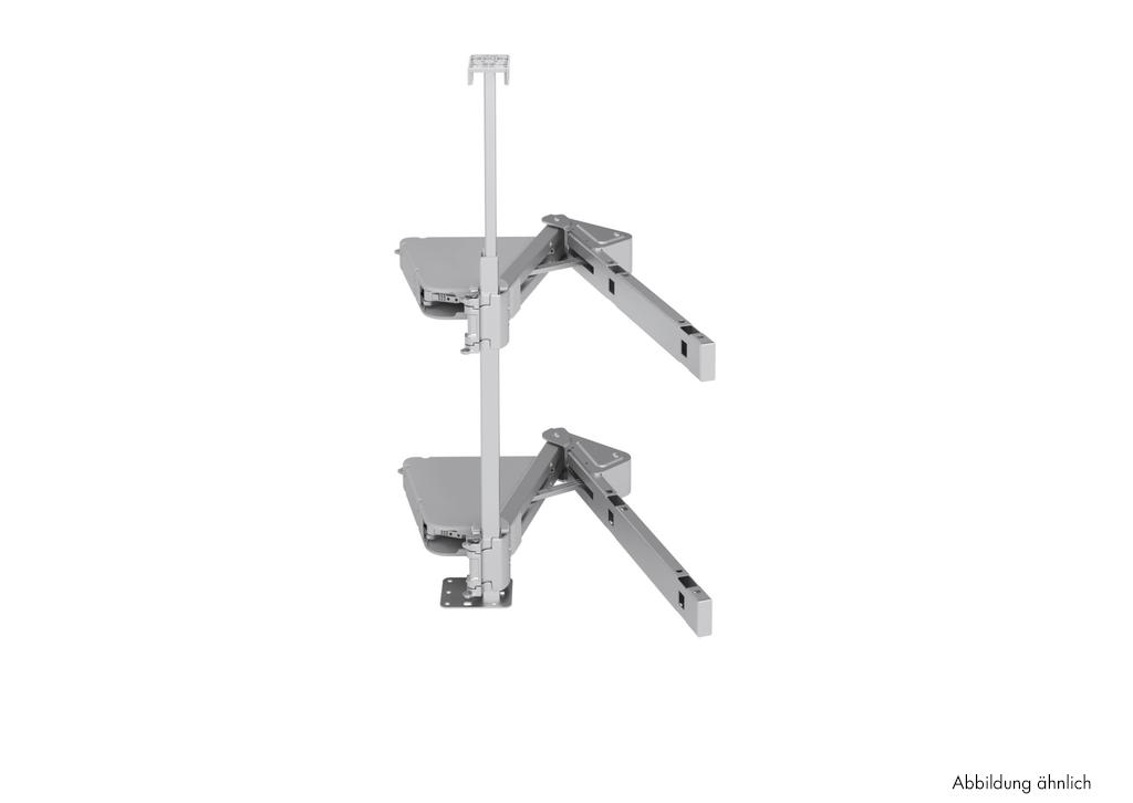 Eckschrank-Schwenkbeschlag zur Aufnahme von Tablaren - für 900 mm Schrankbreite und 450 mm Türbreite - für 1000 mm Schrankbreite und 500 oder 600 mm Türbreite - Einbauhöhe 650 13850 mm - Einbautiefe mind. 490 mm - teleskopierbar - rechts oder links ausschwenkend - geradeausfahrende Schwenktechnik - kein Versperren des Nachbarkorpus. Set bestehend aus: Standrohr - 2 x Schwenkarm - Rohraufnahme oben. Bitte beachten Sie: Tablare müssen separat bestellt werden!