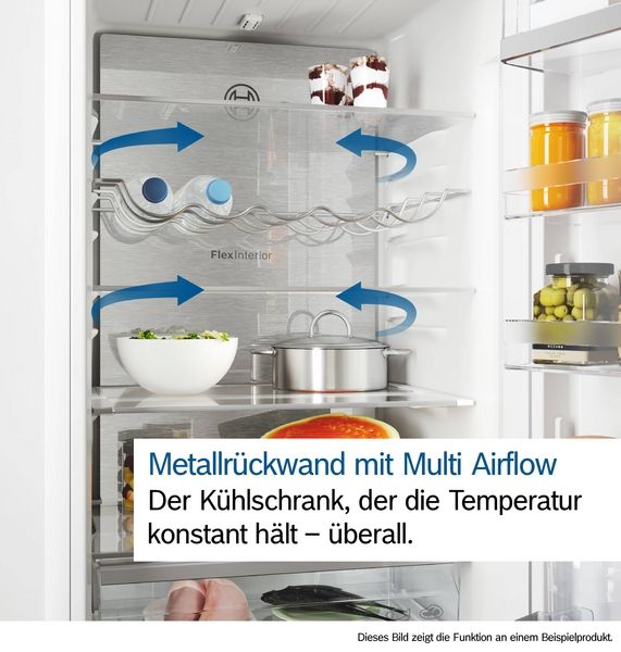 - Metallrückwand mit Multi Airflow: zirkuliert kühle Luft für gleichmäßige Temperatur im Kühlschrank.