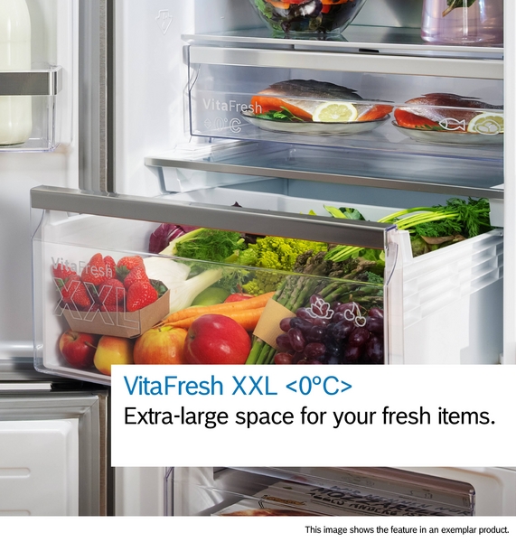 - VitaFresh XXL <0 °C>: hält Lebensmittel in extra großen, luft- und temperaturkontrollierten Schubladen länger frisch.