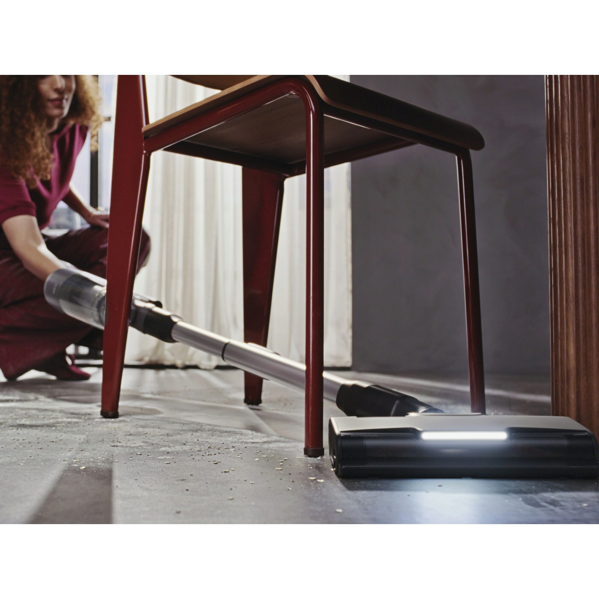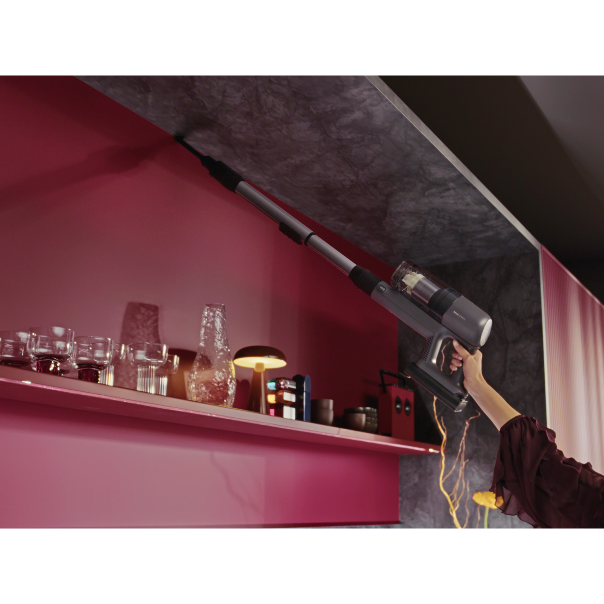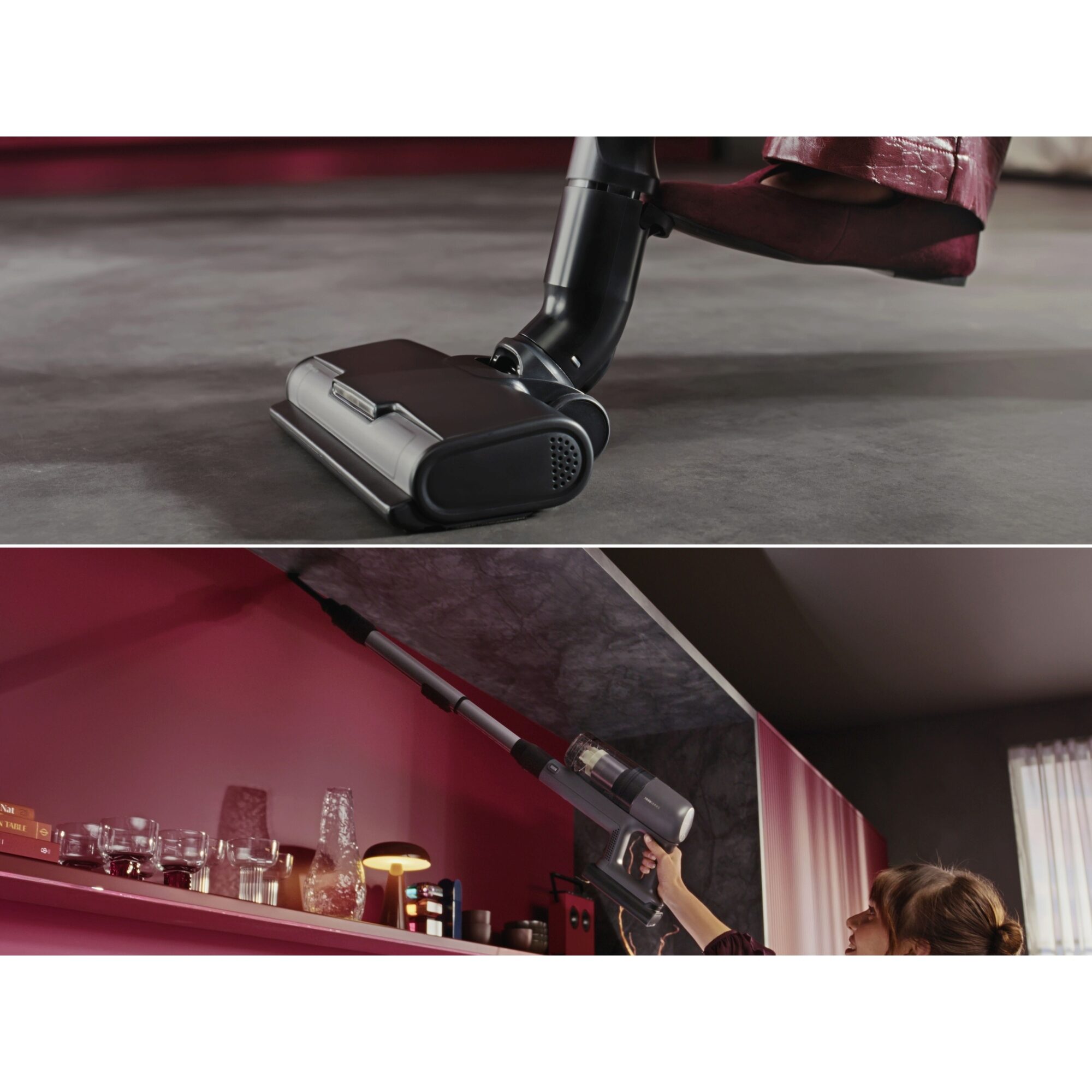 *Basierend auf internen Tests gemäß Norm IEC 62885-4 (Laufzeitmessung Handteil und gesamter Staubsauger im Min-Modus). **Im Vergleich zum Boost-Modus. ***Basierend auf einem internen Test, bei dem zur vollen Abdeckung bei einer Geschwindigkeit von 0,5 m/s jeweils ein Vorwärts- und Rückwärtszug verwendet wurde.