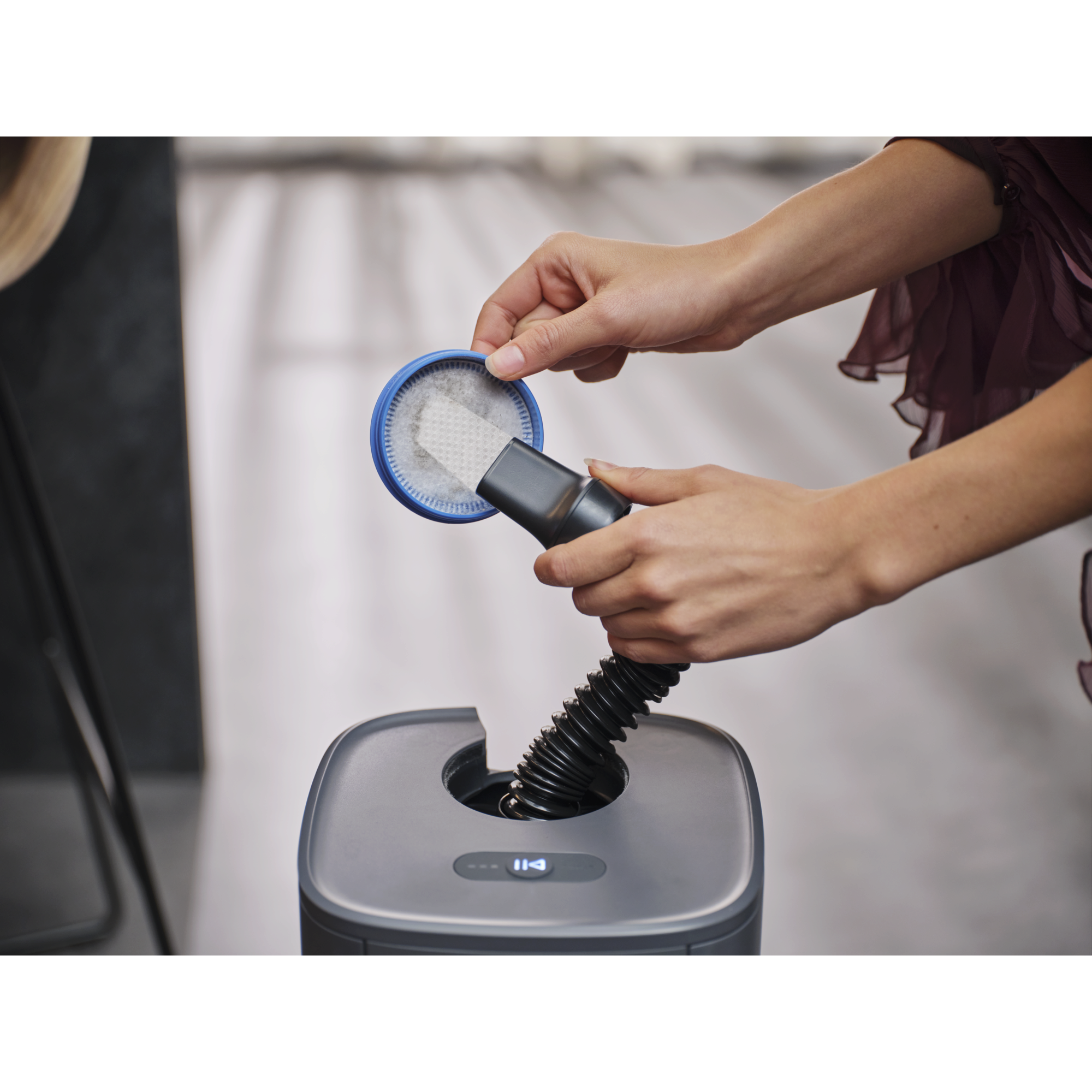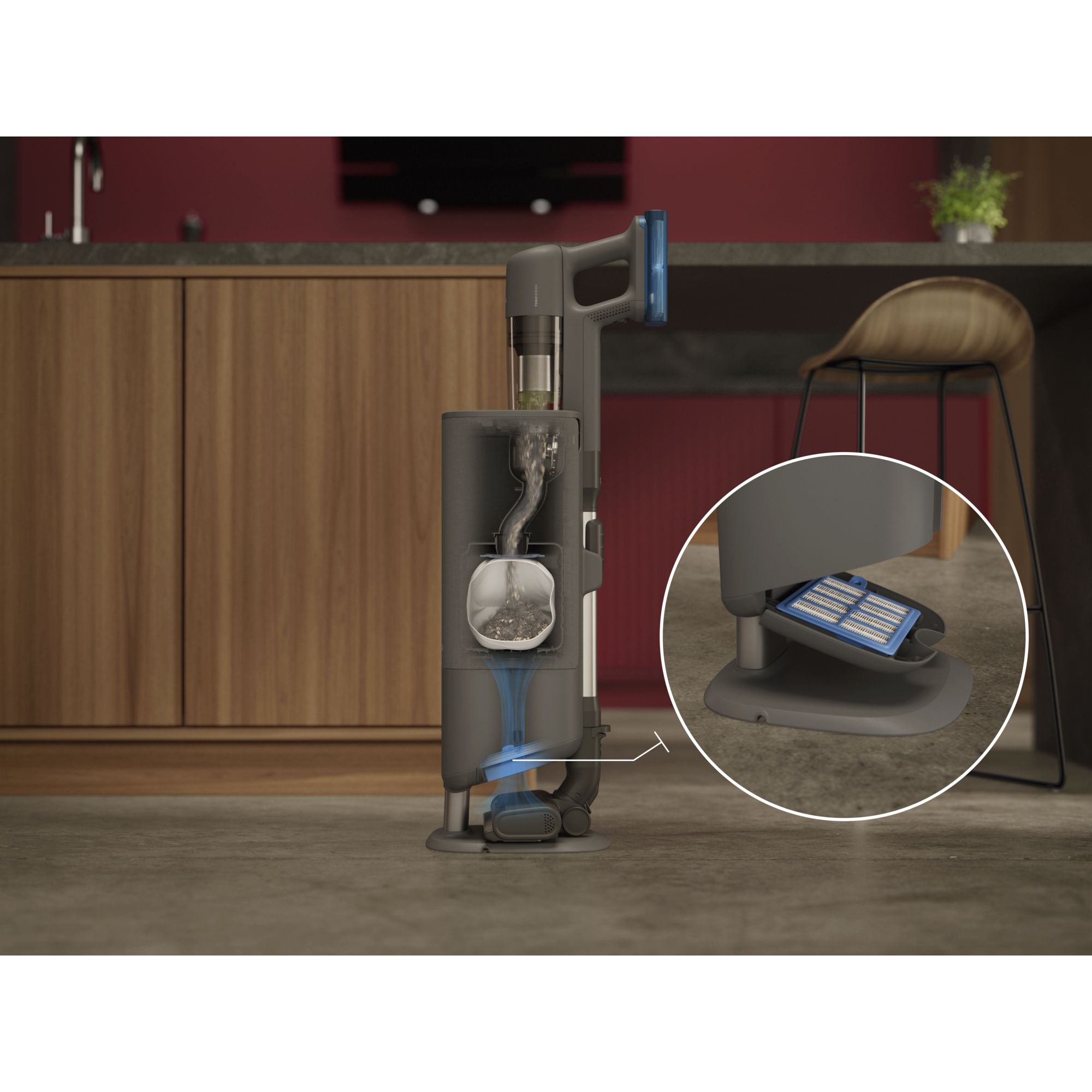 Die Multifunktions-Station saugt den Schmutz automatisch in den 3,5l S-bag* ab und dient zur Aufbewahrung und Aufladung des Geräts und eines Ersatzakkus. Das HEPA-Filtrationssystem filtert bis zu 99,999 %** der Staubpartikel. Ersatzfilter und Filterreinigungsschlauch sorgen für mühelose Pflege.