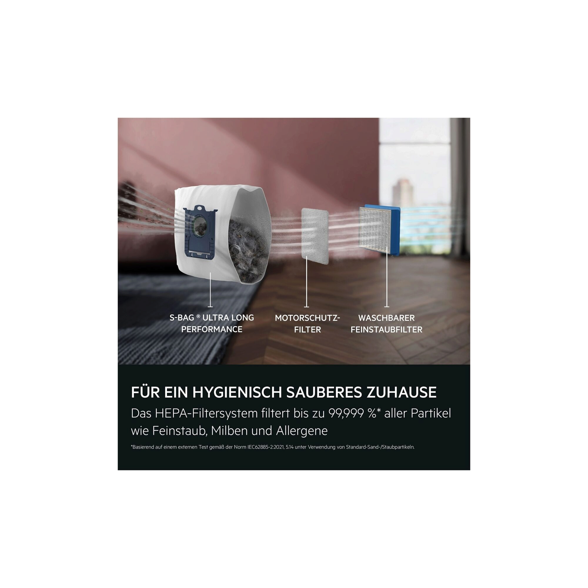 Das effiziente Filtersystem ermöglicht die Entfernung von bis zu 99,999 %* der Partikel mit einer Größe von 0,3 Mikrometer - für saubere Abluft beim Staubsaugen.