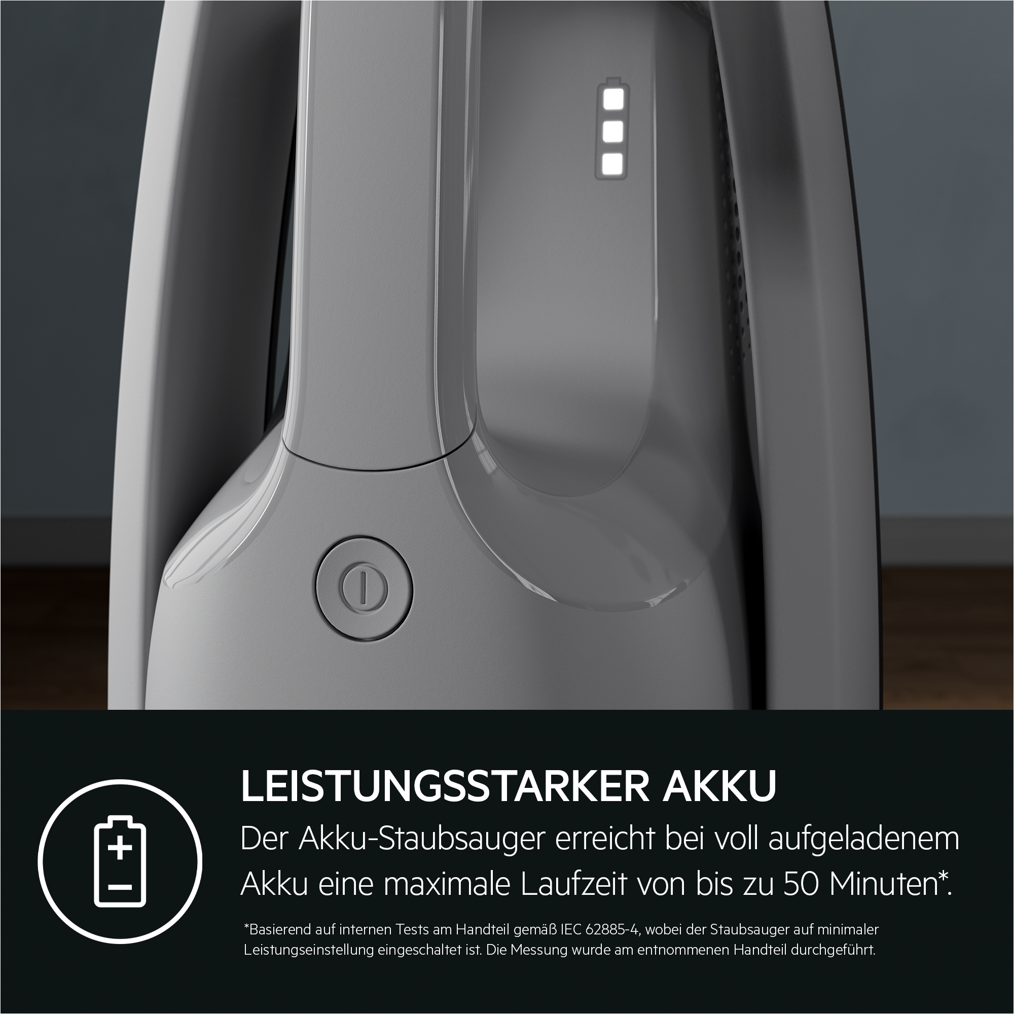 Der Akku-Staubsauger erreicht bei voll aufgeladenem Akku eine maximale Laufzeit von 50 Minuten* für die Reinigung von bis zu 100 m².