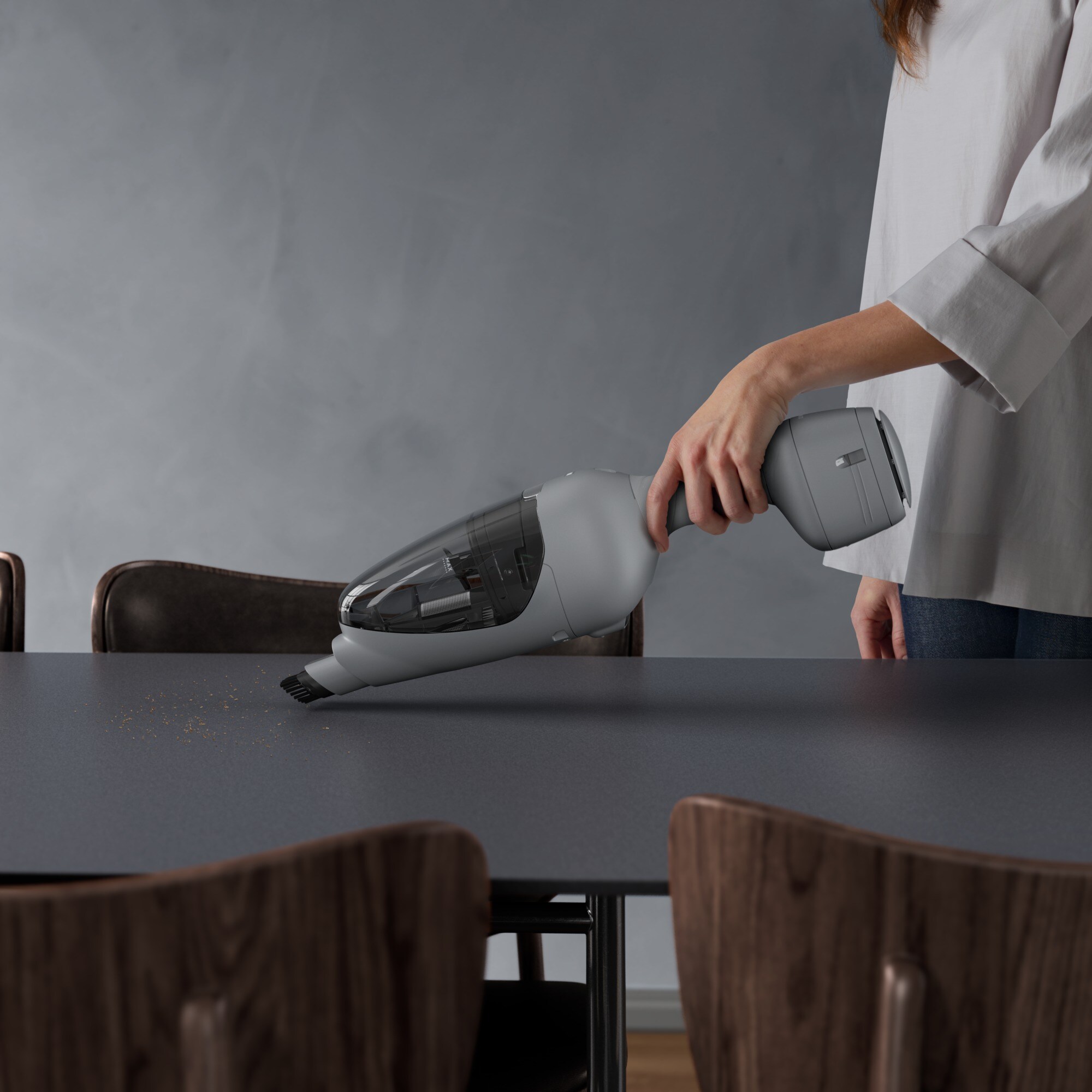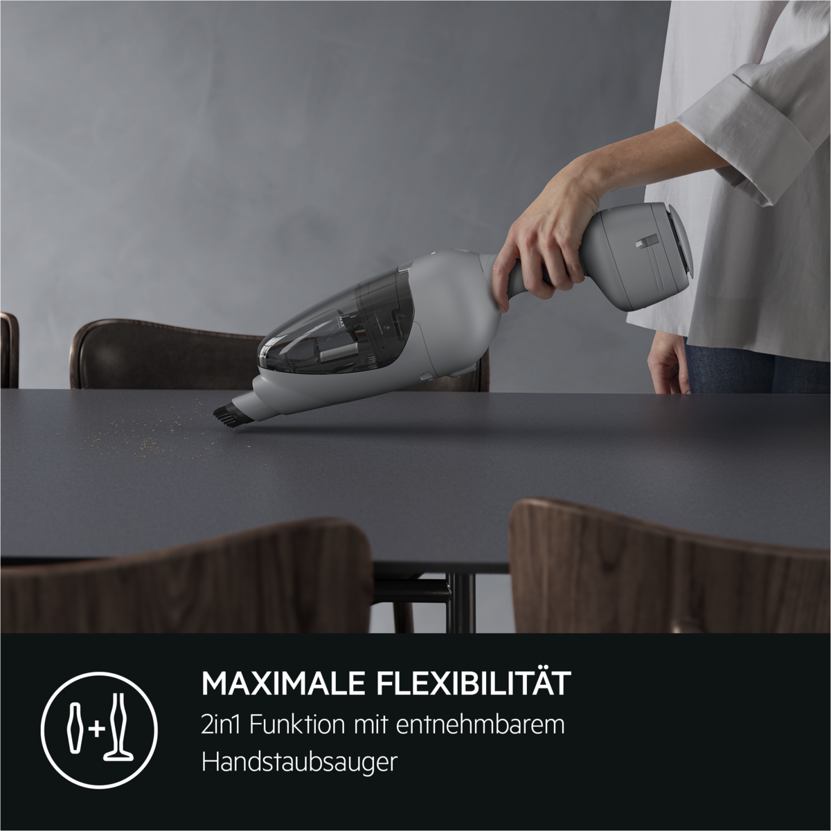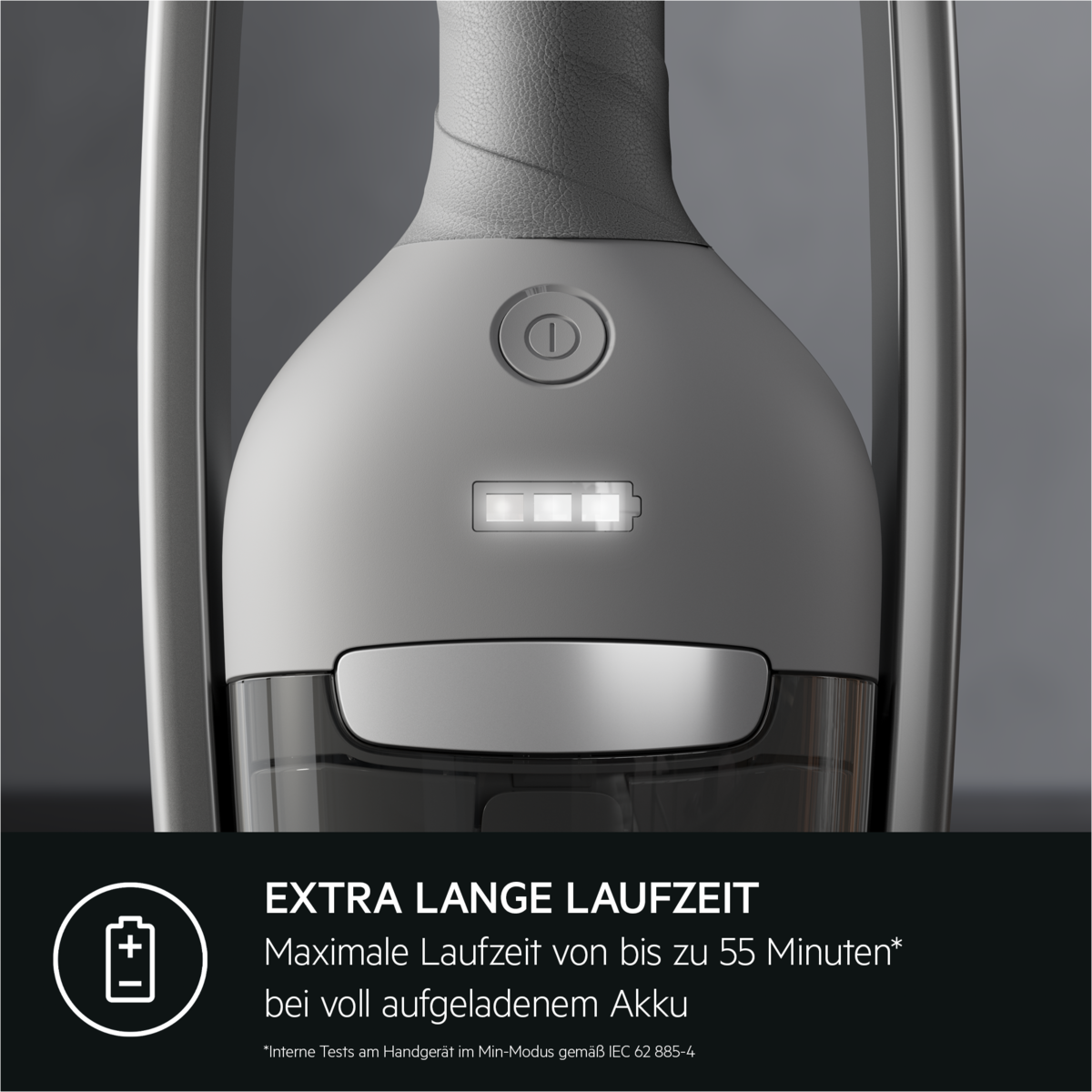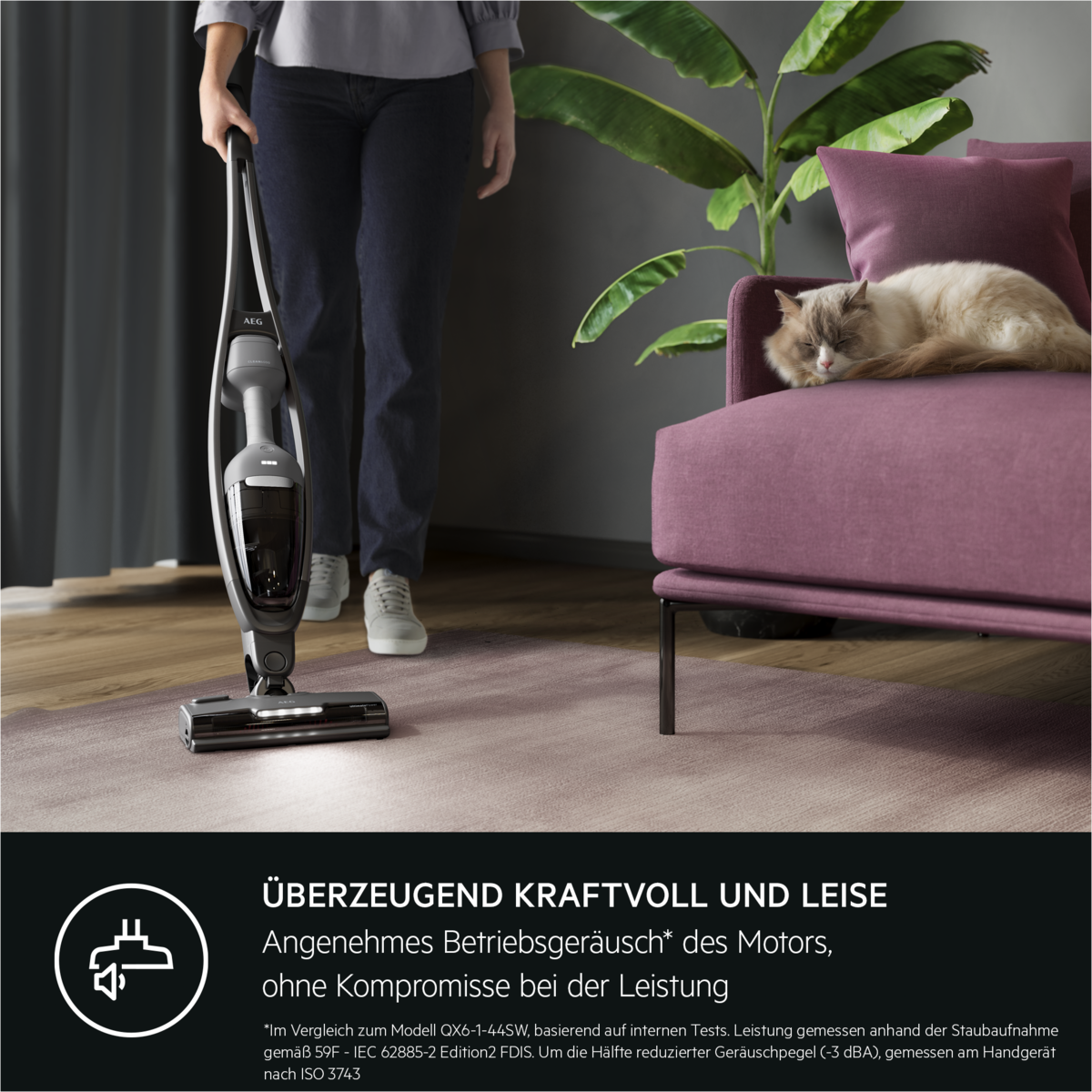 * Im Vergleich zum Modell QX6-1-44SW, basierend auf internen Tests. Leistung gemessen an der Staubaufnahme gemäß 59F - IEC 62885-2 Edition2 FDIS. Halbierter Schallleistungspegel (-3dBA) gemessen am Handgerät nach ISO 3743