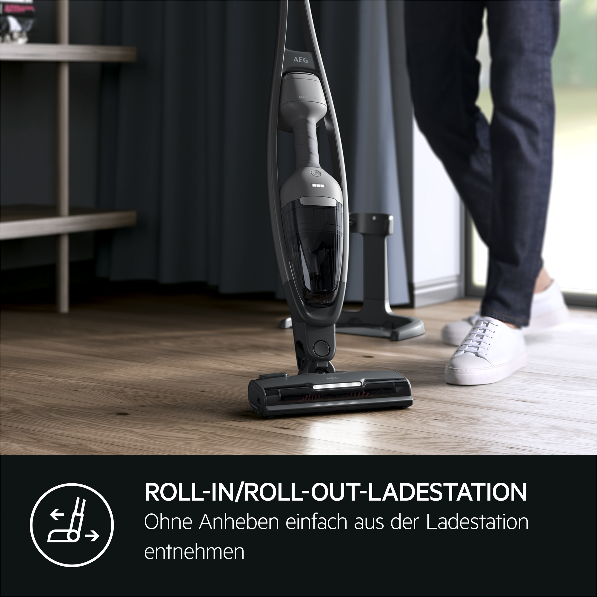Jederzeit griffbereit. Mit der Roll-in/Roll-out-Ladestation musst du den Staubsauger nicht mehr anheben, um ihn zu entnehmen oder wieder zu verstauen. Müheloser Start, müheloses Ende.