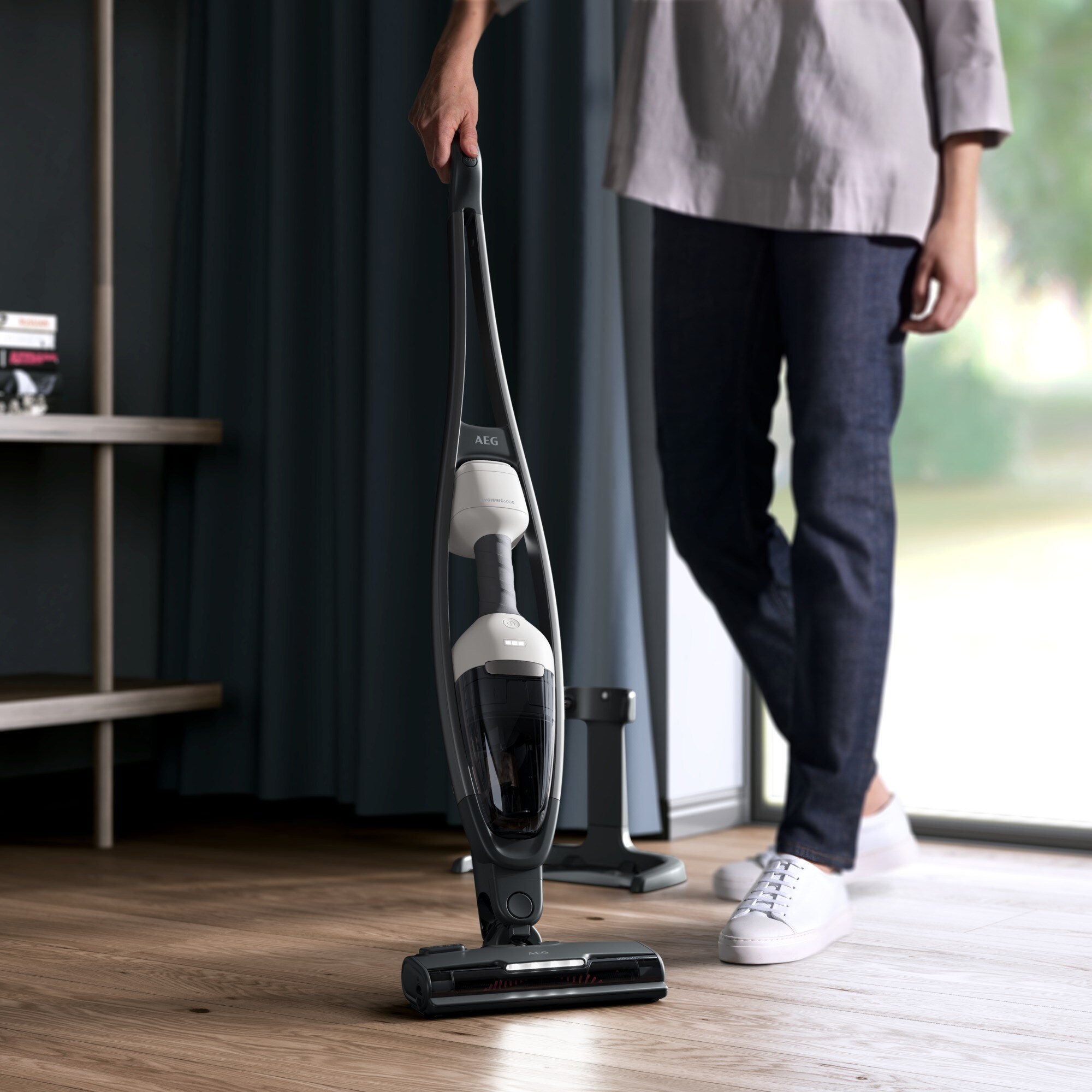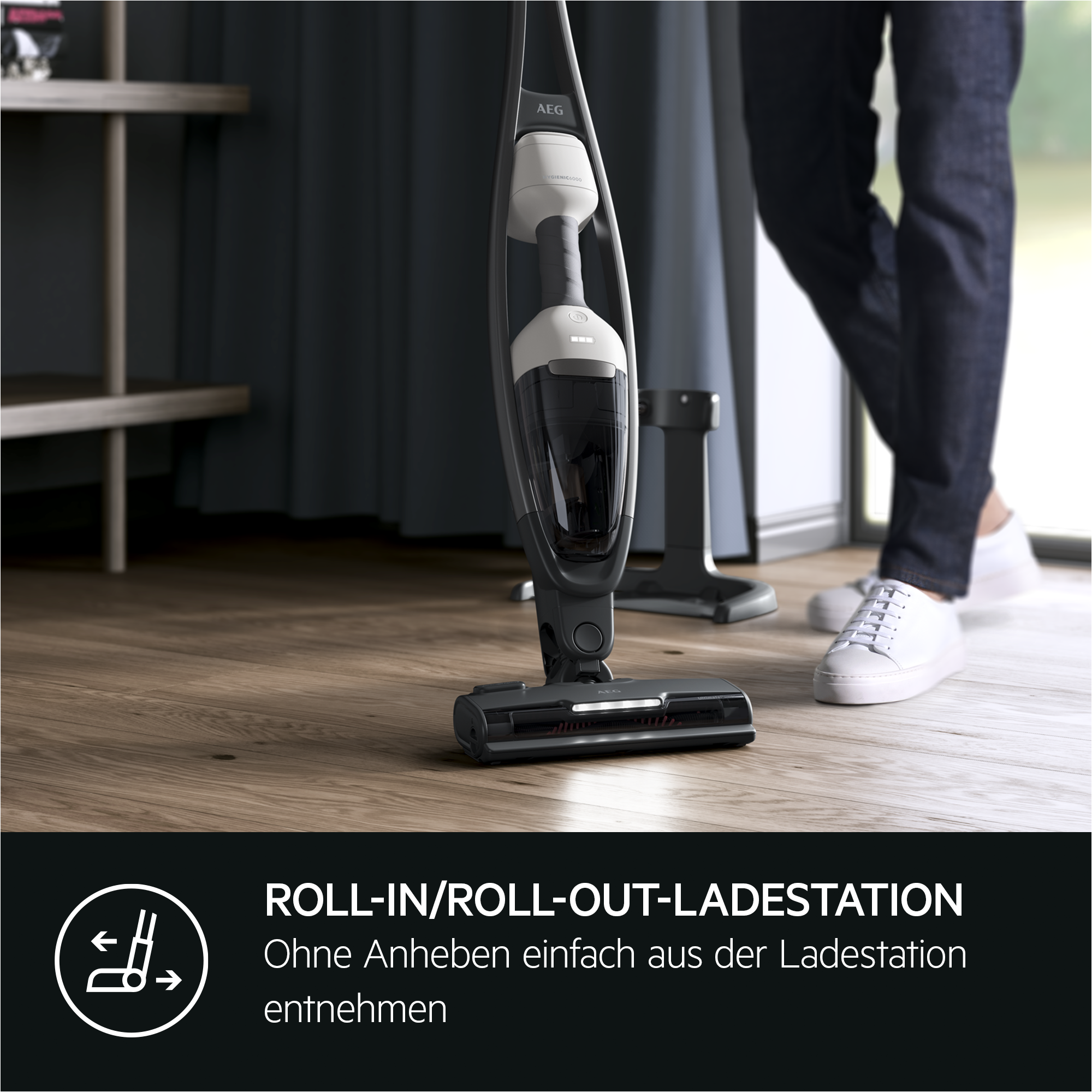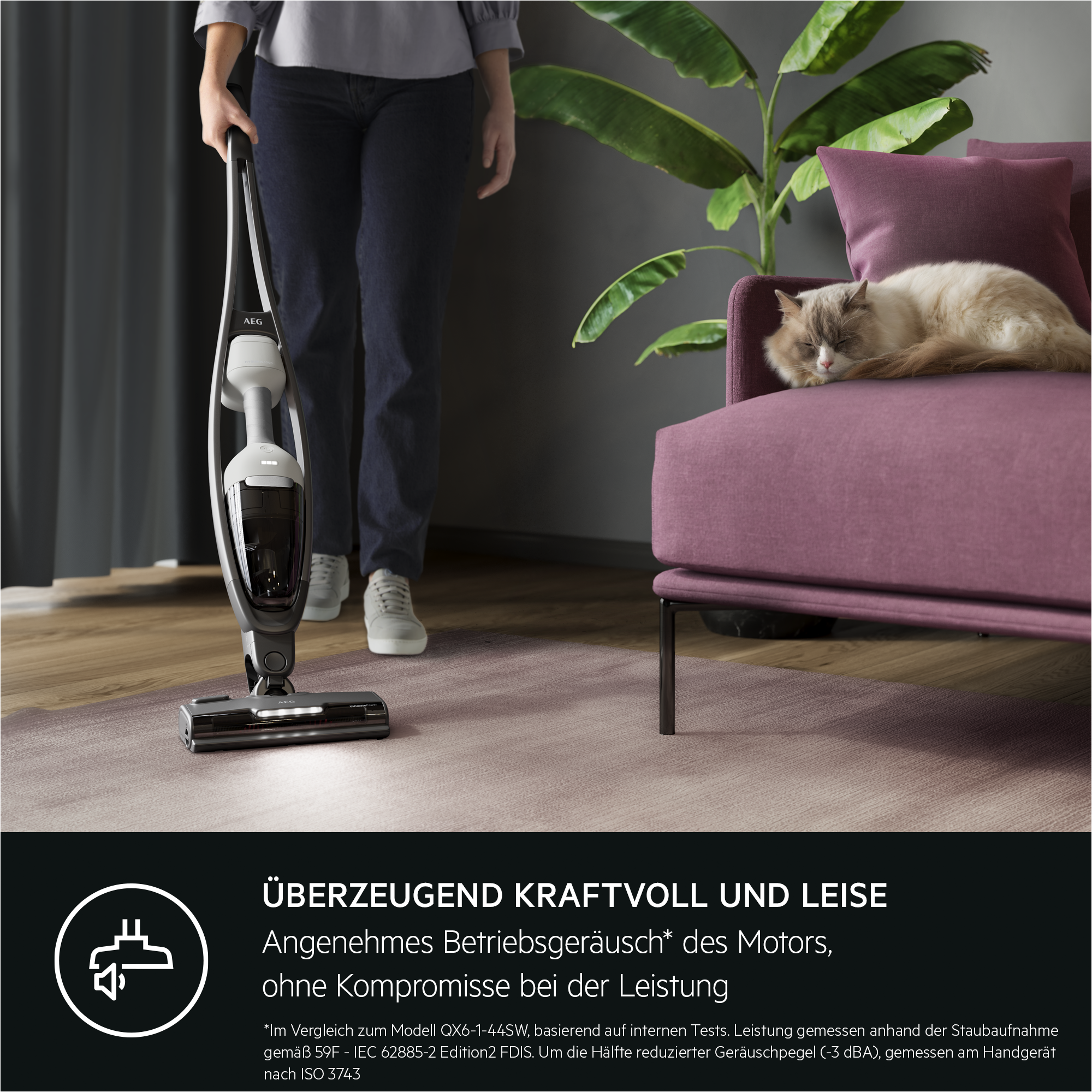 ** Interne Tests gemäß ISO 3743 am Handteil, verglichen mit anderen Akku-Staubsaugern von AEG, wie dem Modell QX6-1-44SW (Aug, 2021).