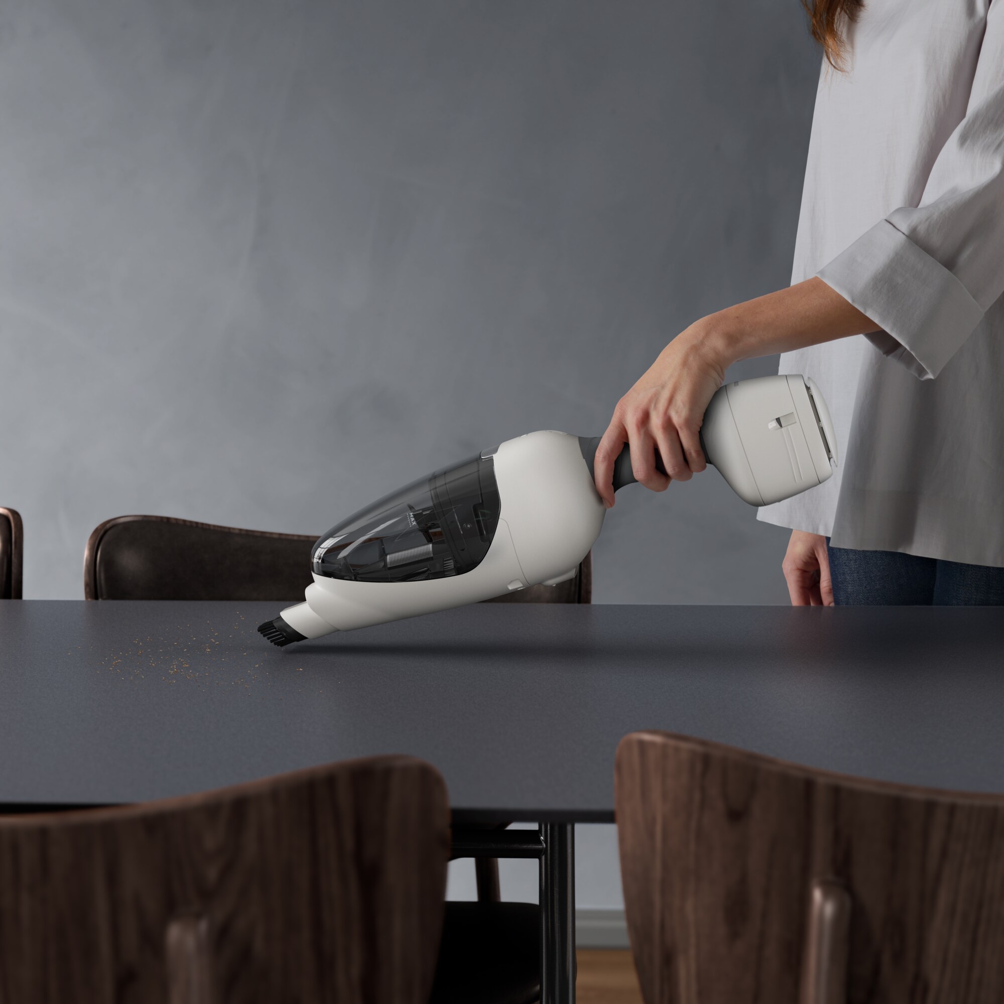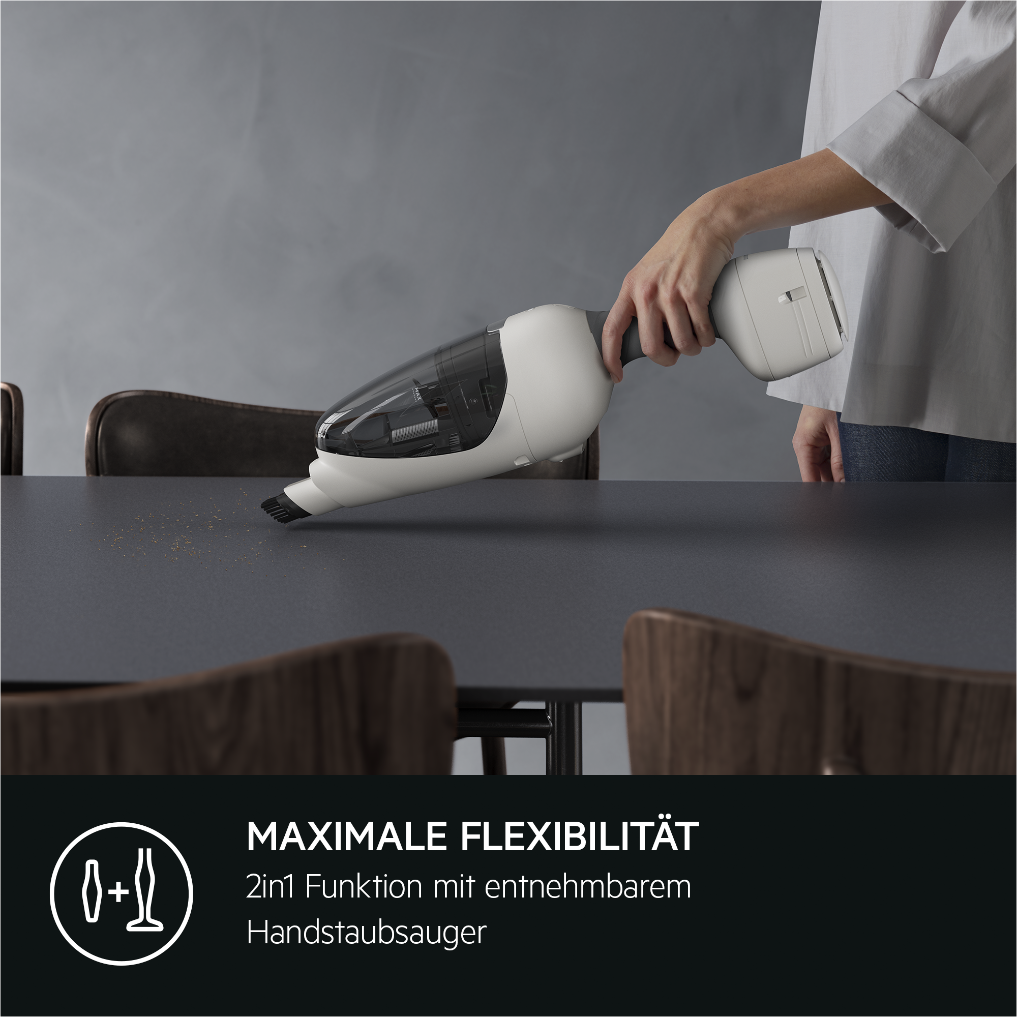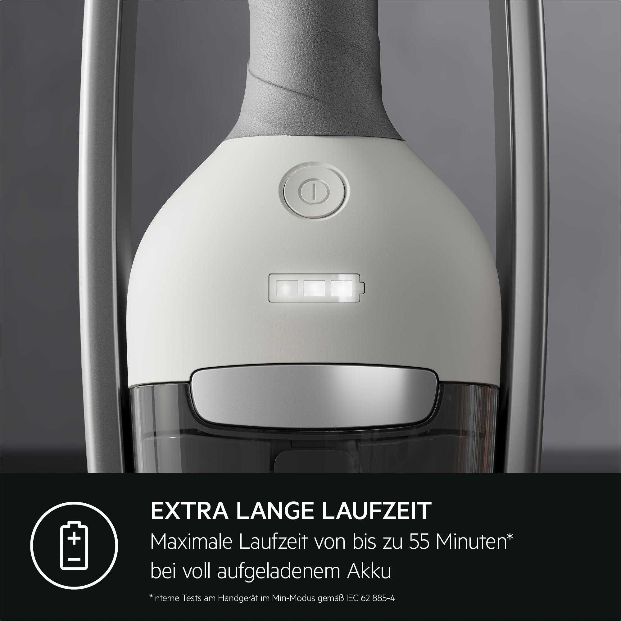 * Im Vergleich zum Modell QX6-1-44SW, basierend auf internen Tests. Leistung gemessen an der Staubaufnahme gemäß 59F - IEC 62885-2 Edition2 FDIS. Halbierter Schallleistungspegel (-3dBA) gemessen am Handgerät nach ISO 3743