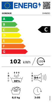- Energieverbrauch des Standard-Baumwollprogramms bei vollständiger Befüllung für elektrisch beheizte Haushaltswäschetrockner (2010/30/EC): 1.92 kWh