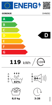 - Energieverbrauch des Standard-Baumwollprogramms bei vollständiger Befüllung für elektrisch beheizte Haushaltswäschetrockner (2010/30/EC): 1.92 kWh