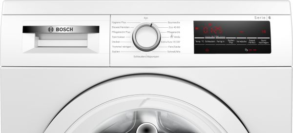 Großes, übersichtliches LED-Display für Programmablauf, Temperaturwahl, max. Schleuderdrehzahl, Restzeitanzeige und 24 h Endezeitvorwahl, Beladungsempfehlung und Verbrauchsanzeige