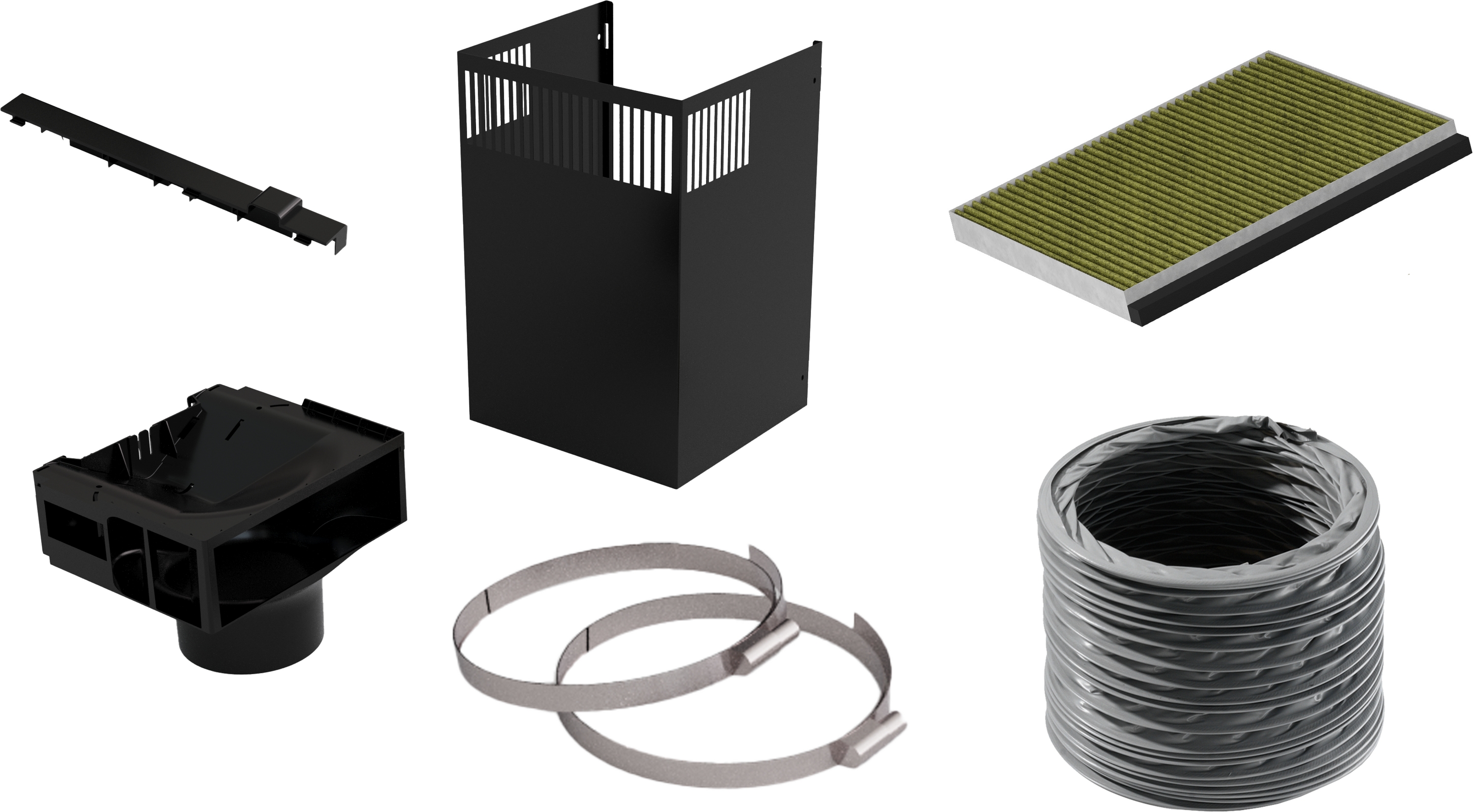 Bestehend aus einem Long-life Clean Air Aktivkohlefilter, Deflektor, flexiblem Schlauch, 2 Schlauchschellen und Befestigungsmaterial.